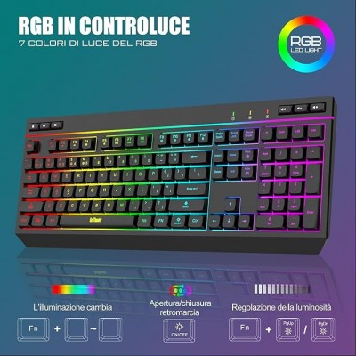 • 【Batteria Ricaricabile e di Lunga Durata】La combinazione è dotata di una batteria a lunga durata che consente un utilizzo continuo per 8 ore con la luce. La tastiera e il mouse sono dotati di funzioni intelligenti di risparmio energetico. Se non si effettuano operazioni entro 8 minuti, si mettono automaticamente a riposo; per risvegliarli è sufficiente premere un tasto qualsiasi. Si prega di caricare per 8 ore prima dell'uso.